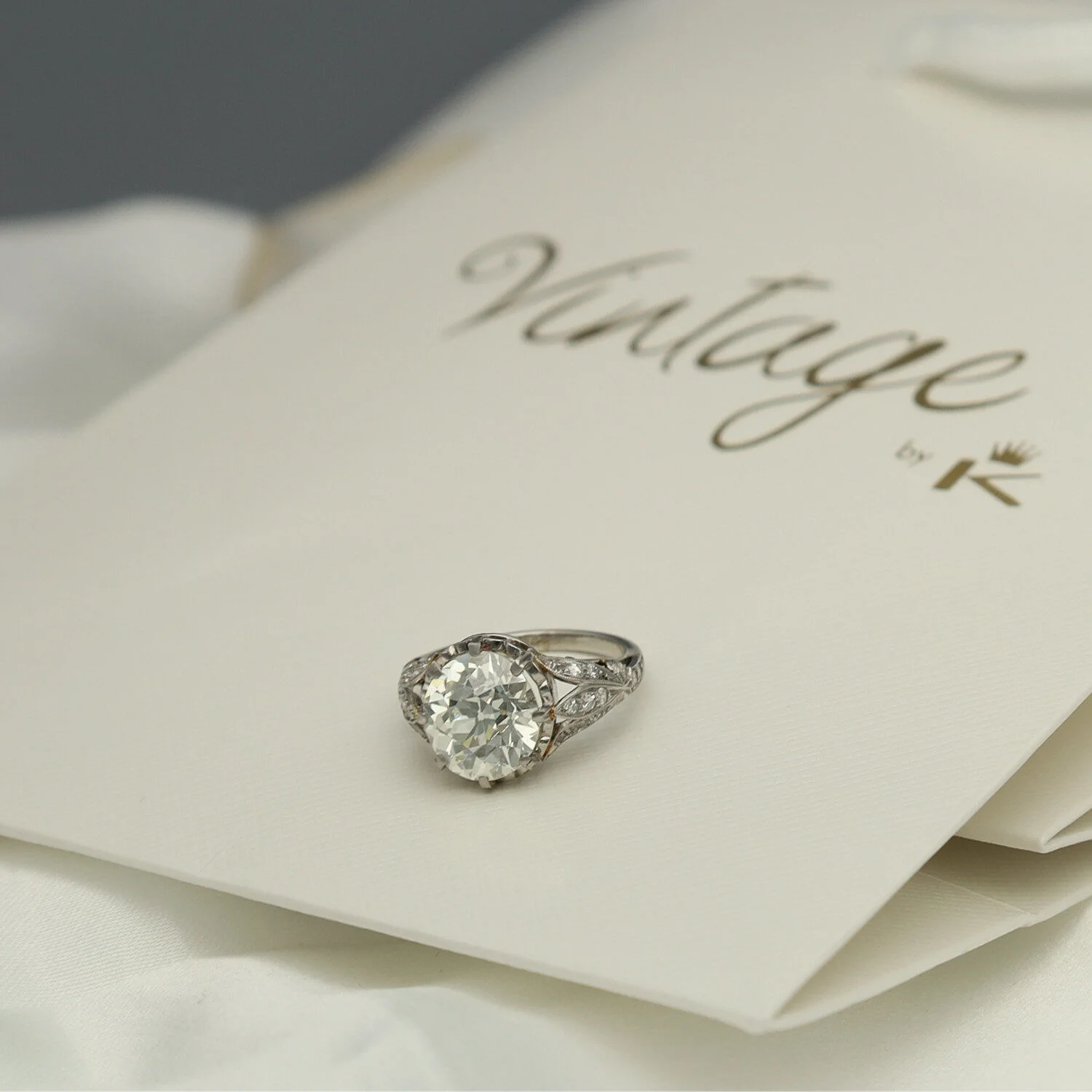 En su centro, un deslumbrante diamante talla antigua de 3.32 ct, VS2 y color K, certificado por HRD Antwerp, que irradia un brillo sereno y lleno de historia. La pieza se adorna con 26 diamantes naturales de 0.01 ct, que aportan destellos sutiles y realzan la elegancia atemporal de su diseño.