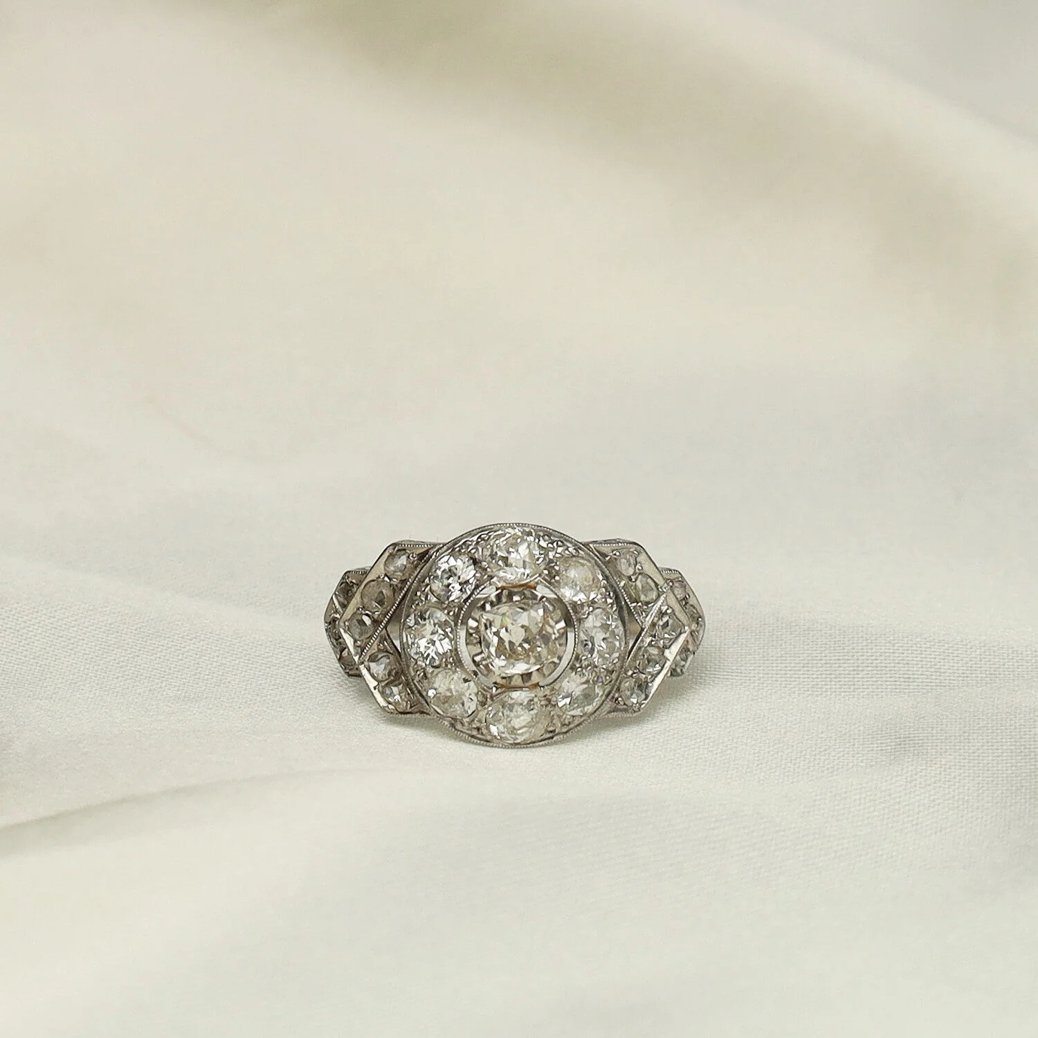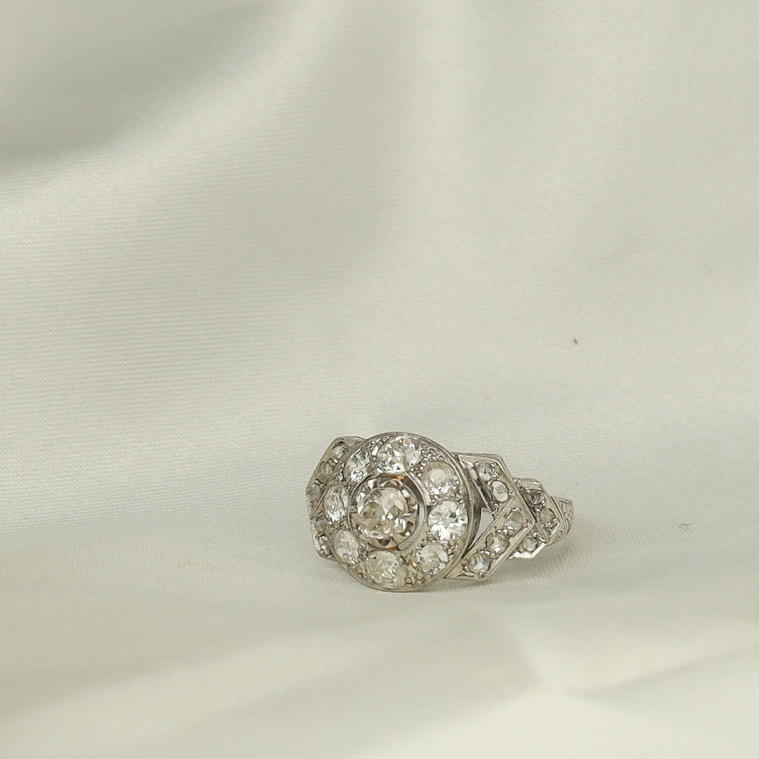 Anillo en platino con una exquisita montura de estilo roseta de inspiración victoriana, donde las formas geométricas y los delicados detalles evocan la elegancia romántica de la época. En el centro, destaca un diamante talla antigua de aproximadamente 0.30 ct, estimado en color H y pureza SI, que aporta brillo y carácter a la pieza.