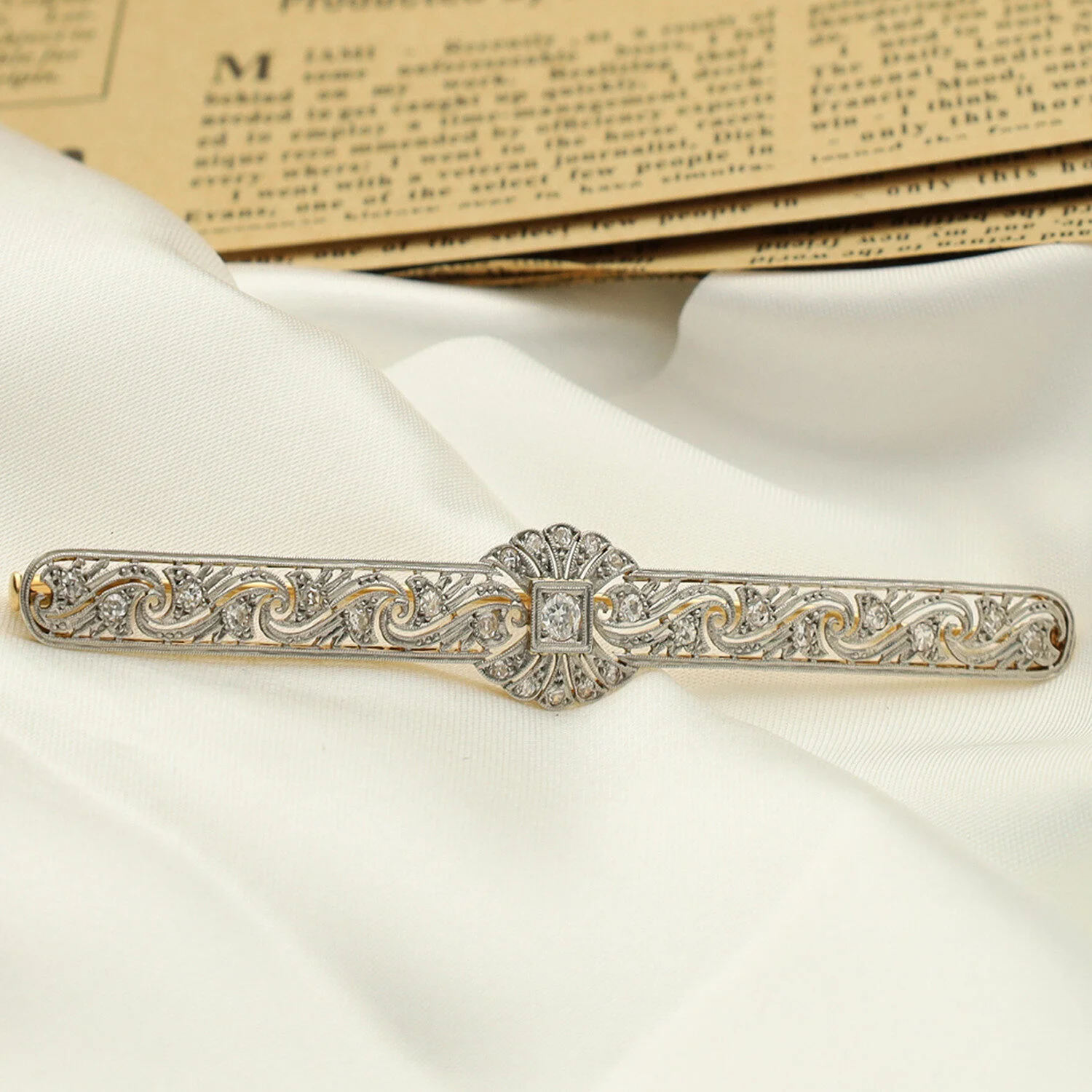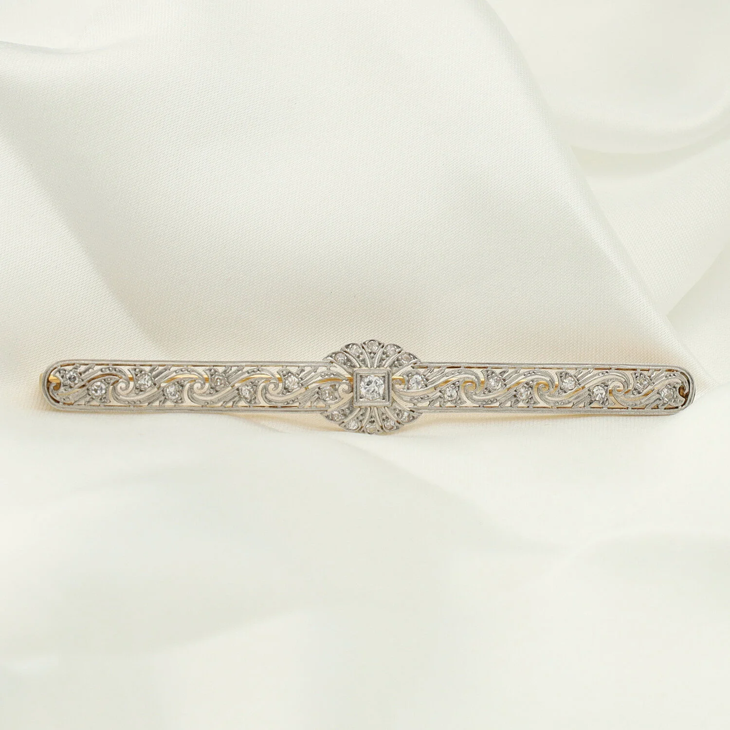 Broche de alfiler Art Decó en oro amarillo con exquisitas vistas de platino.