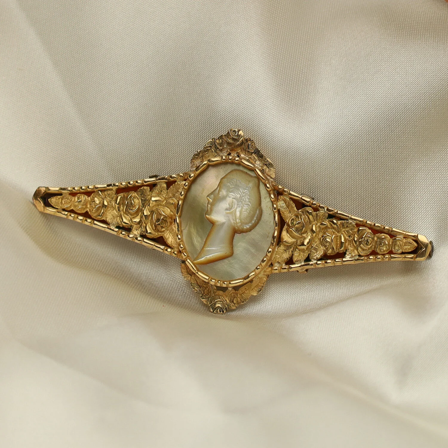 Encantador broche victoriano en oro amarillo, con delicadas influencias románticas. Su montura, finamente trabajada, luce rosas talladas que enmarcan un camafeo central tallado en nácar, evocando la elegancia y el simbolismo sentimental de la época.