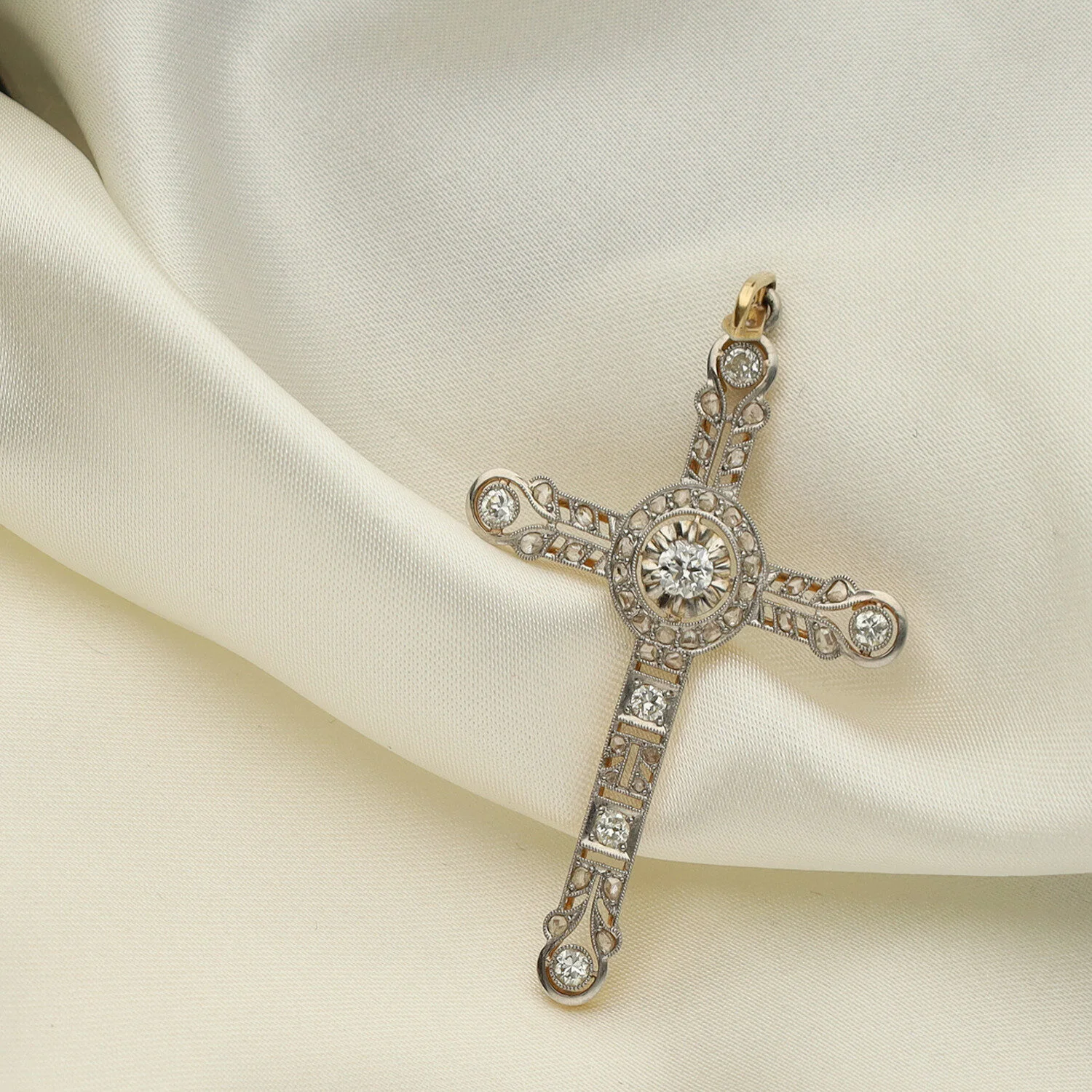Elegante colgante en forma de cruz, realizado en oro amarillo con delicadas vistas en platino.