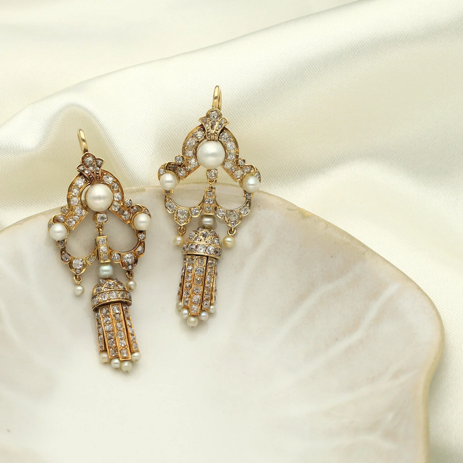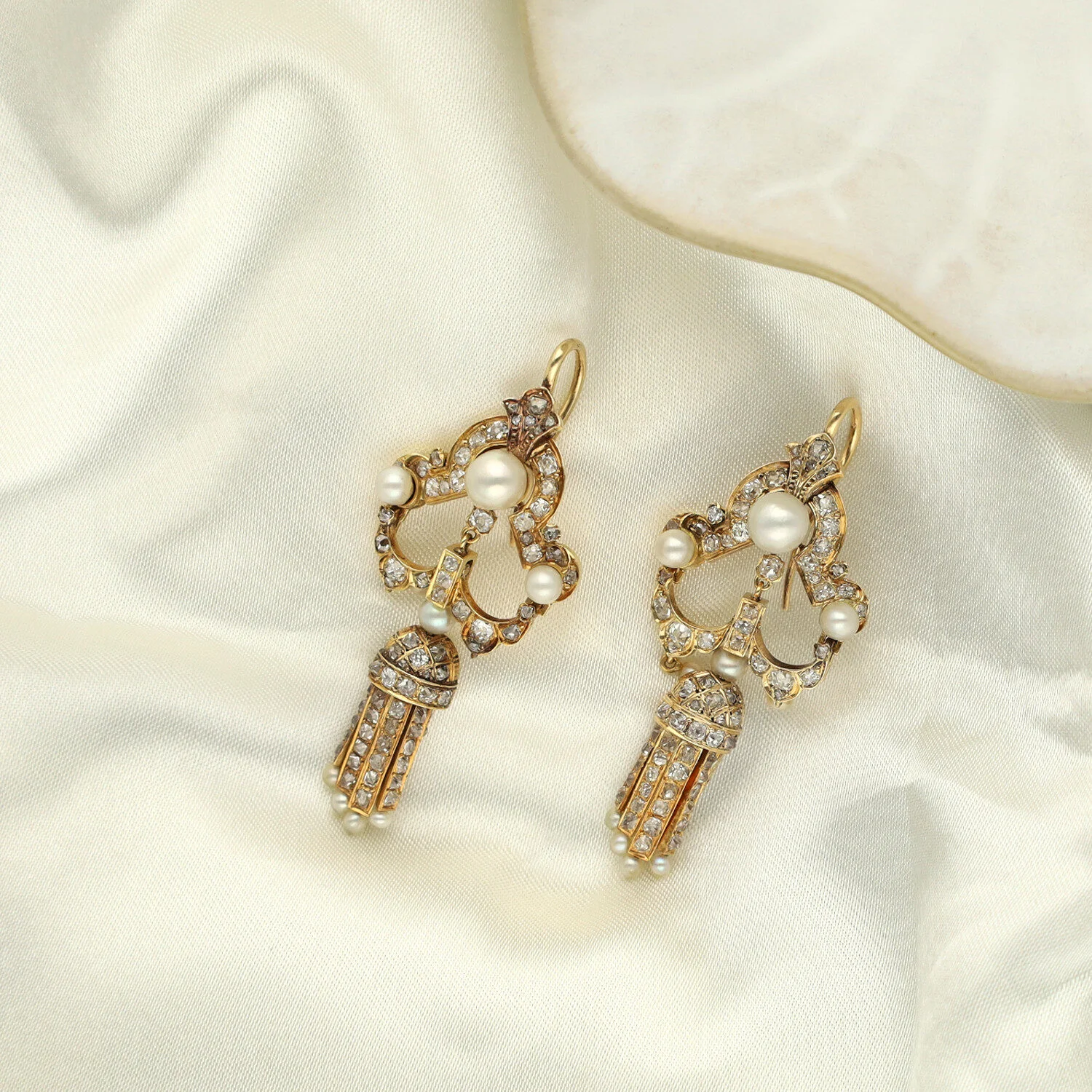 Elegantes pendientes colgantes en oro amarillo de 18K combinan la suavidad de las perlas Akoya con el resplandor de diamantes naturales de talla antigua. Cada pendiente presenta dos perlas centrales de 5.7 mm, rodeadas por seis perlas de 3.5 mm y catorce perlas de 2.1 mm, creando una armoniosa cascada de elegancia. Un total de 104 diamantes naturales, con un peso aproximado de 1.36 ct, de color G-H y pureza SI, aportan un brillo excepcional, realzando la sofisticación de esta pieza única. Perfectos para momentos de distinción.