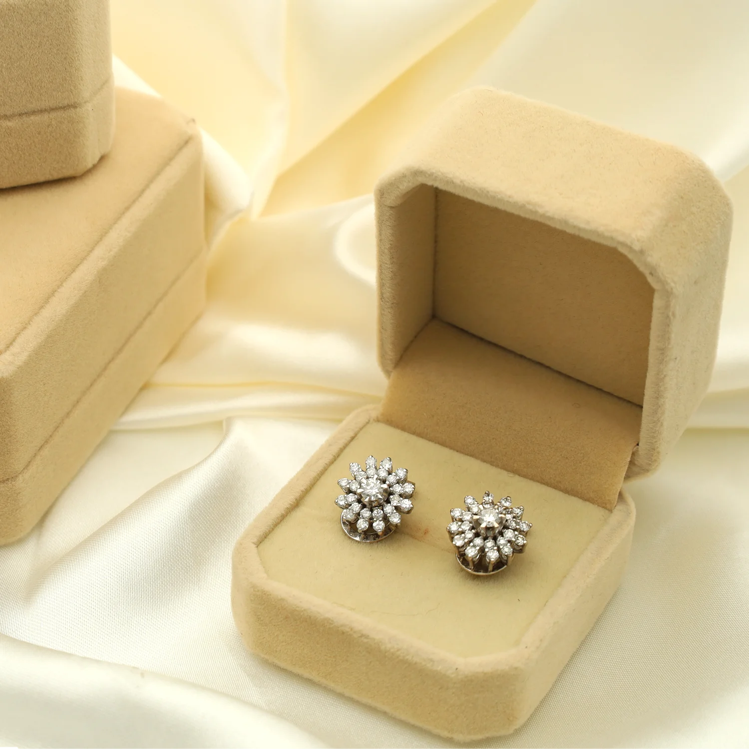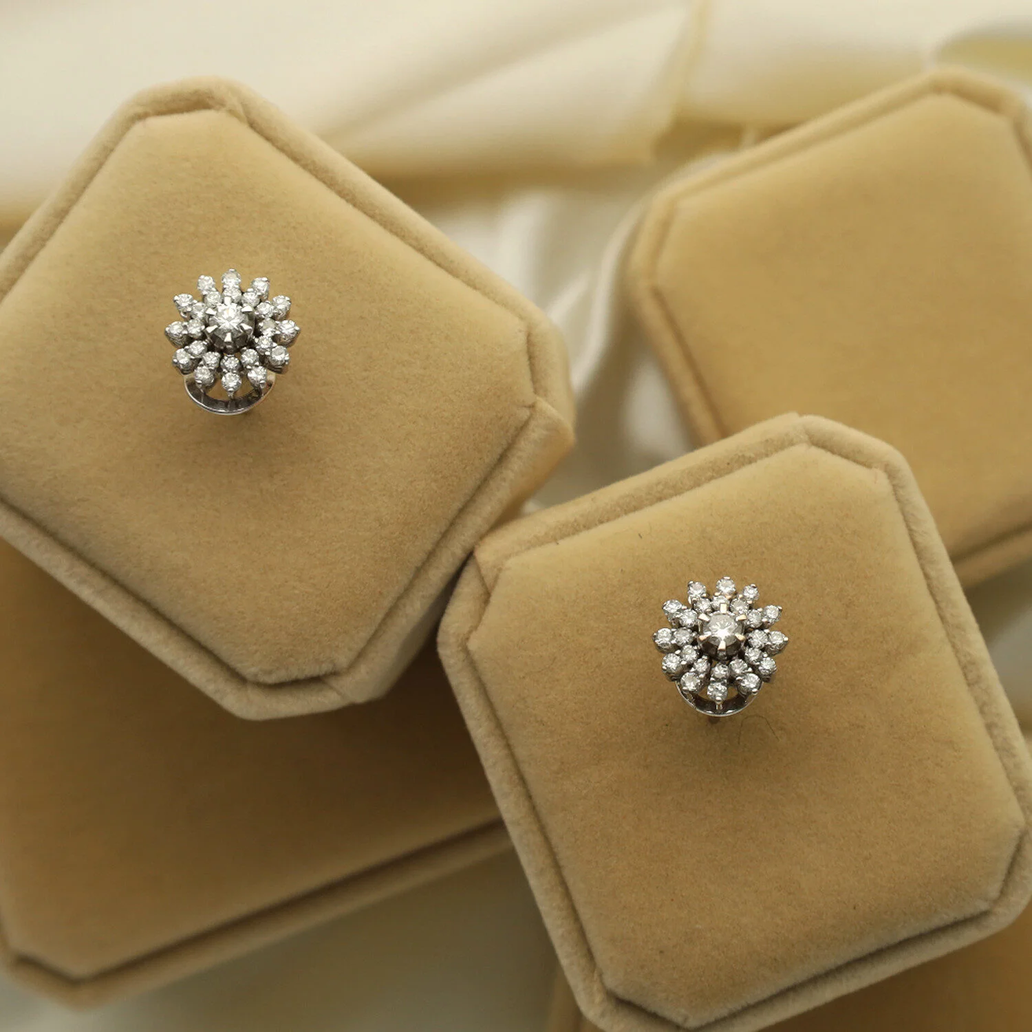 Estos exquisitos pendientes estilo floral Vintage en oro blanco de 18K capturan la esencia de la elegancia clásica. Presentan un diseño delicado, inspirado en la belleza natural de las flores, con diamantes de 1.36 ct en total que aportan un resplandor sublime. Los diamantes naturales centrales, de 0.20 ct cada uno, son la joya de la corona, rodeados por una delicada disposición de diamantes naturales más pequeños que realzan su brillo y destellos. El cierre omega, sofisticado y seguro, completa este par de pendientes, asegurando comodidad y estabilidad en cada uso. Una joya perfecta para quienes buscan un toque de lujo atemporal y distinción en su estilo.