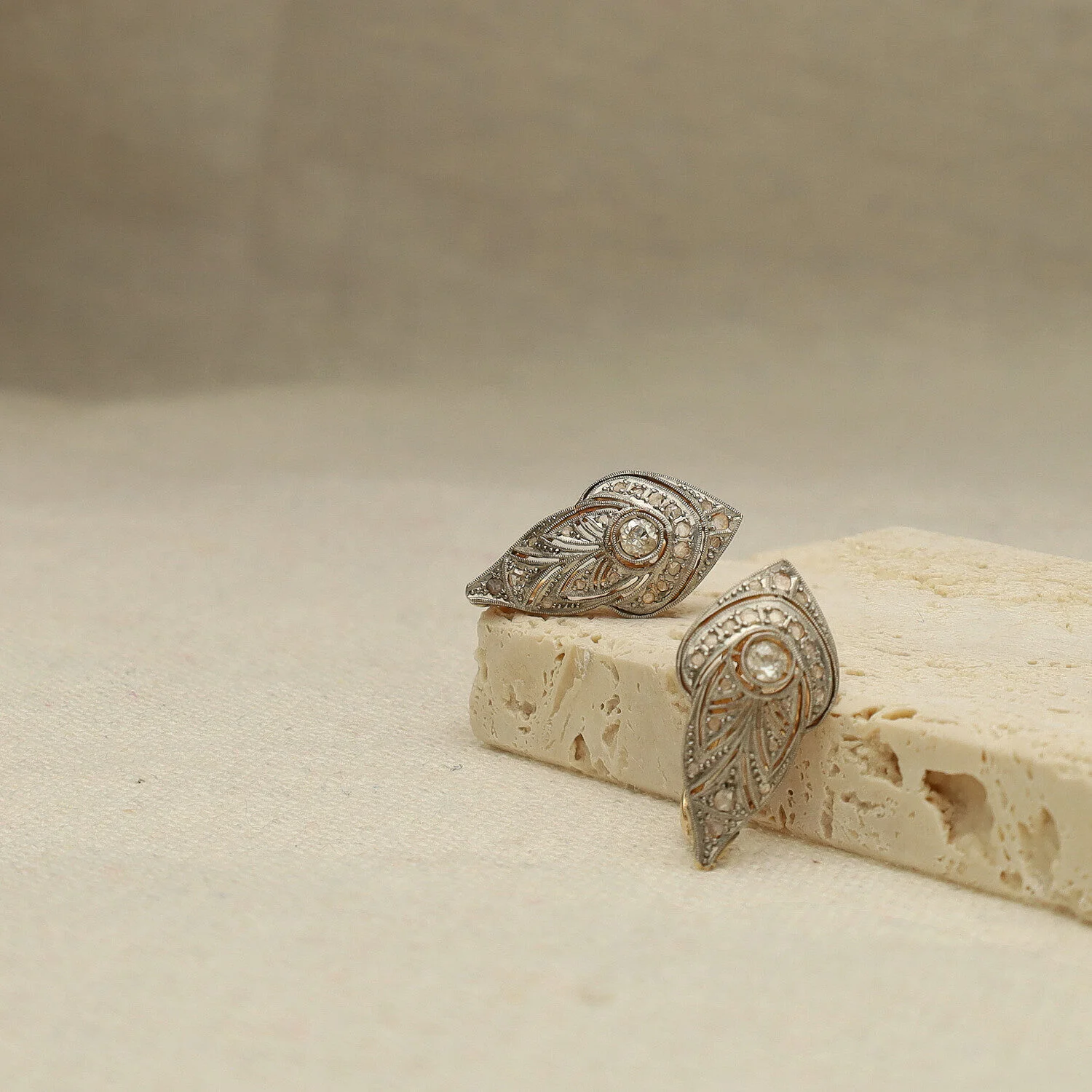 Estos exquisitos pendientes vintage en oro amarillo con vistas de platino,