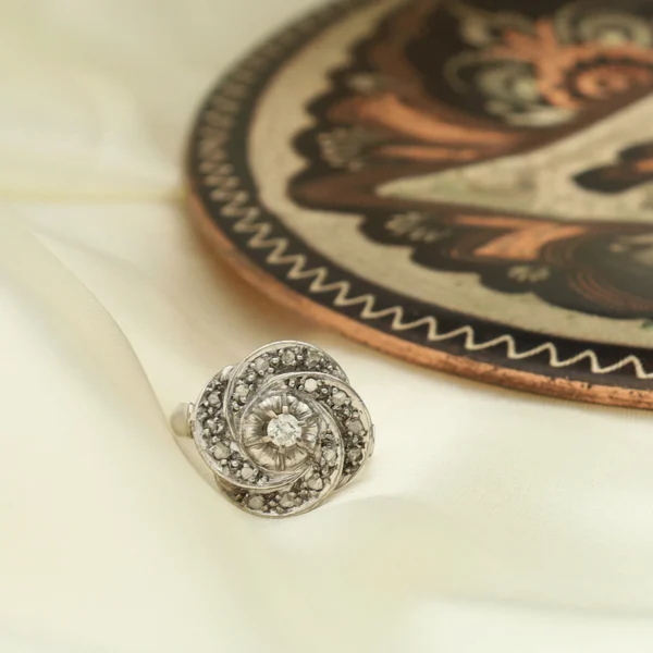 Anillo vintage en oro blanco con una elegante montura en espiral, donde 16 diamantes talla roca se entrelazan armoniosamente en los brazos.