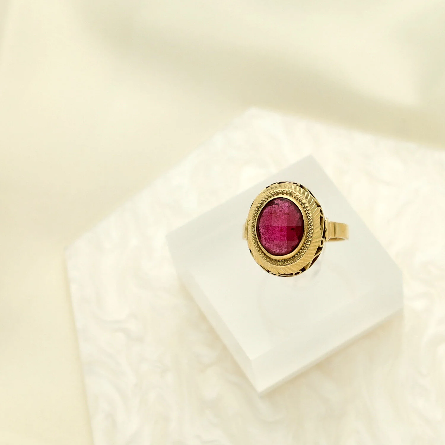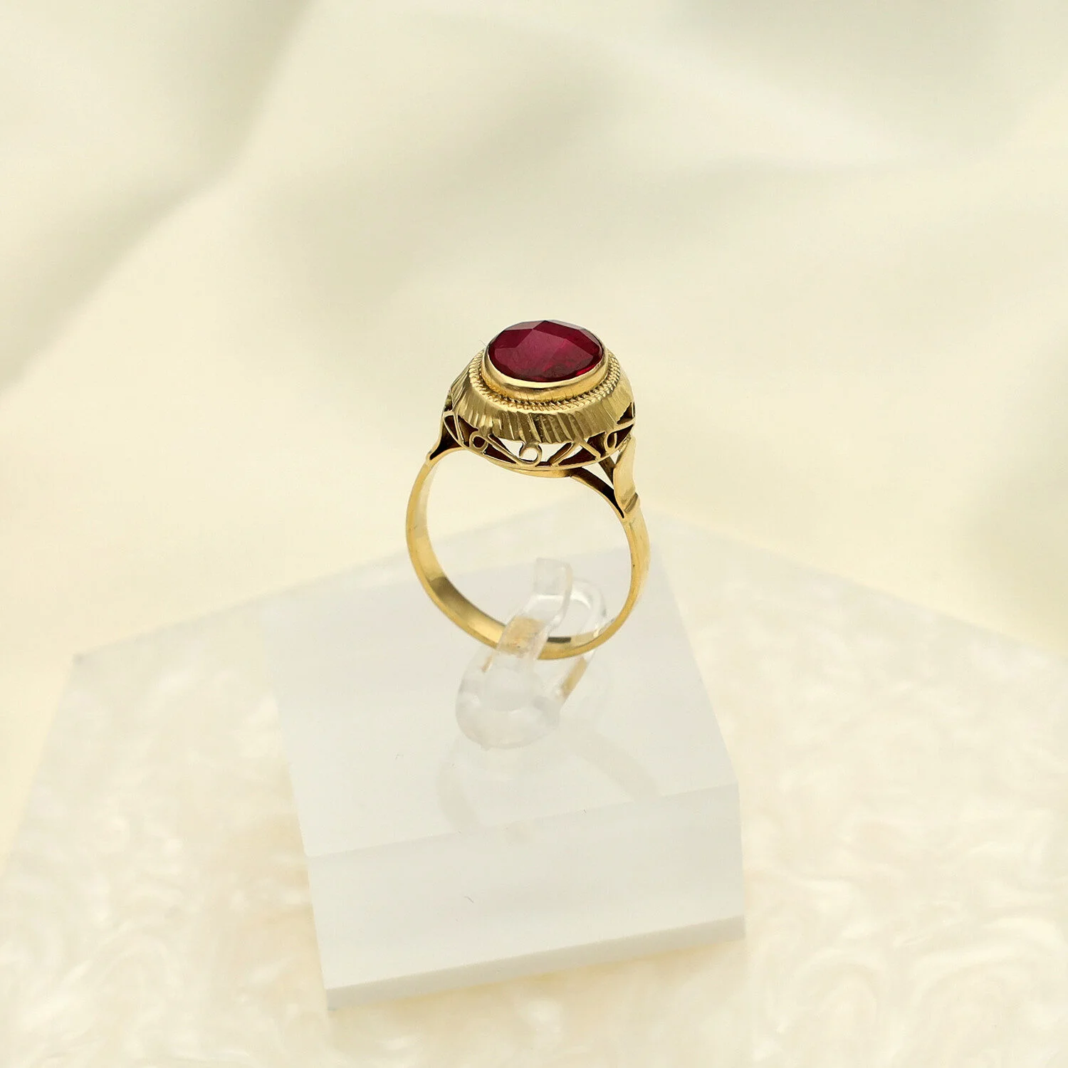 Sortija Retro en oro amarillo de 18K, que realza un rubí oval facetado de aproximadamente 4.62 ct. Su vibrante tonalidad roja resalta con elegancia sobre la montura, cuya estructura refinada refleja el encanto de las piezas de mediados del siglo XX. Un diseño atemporal que fusiona sofisticación y carácter.