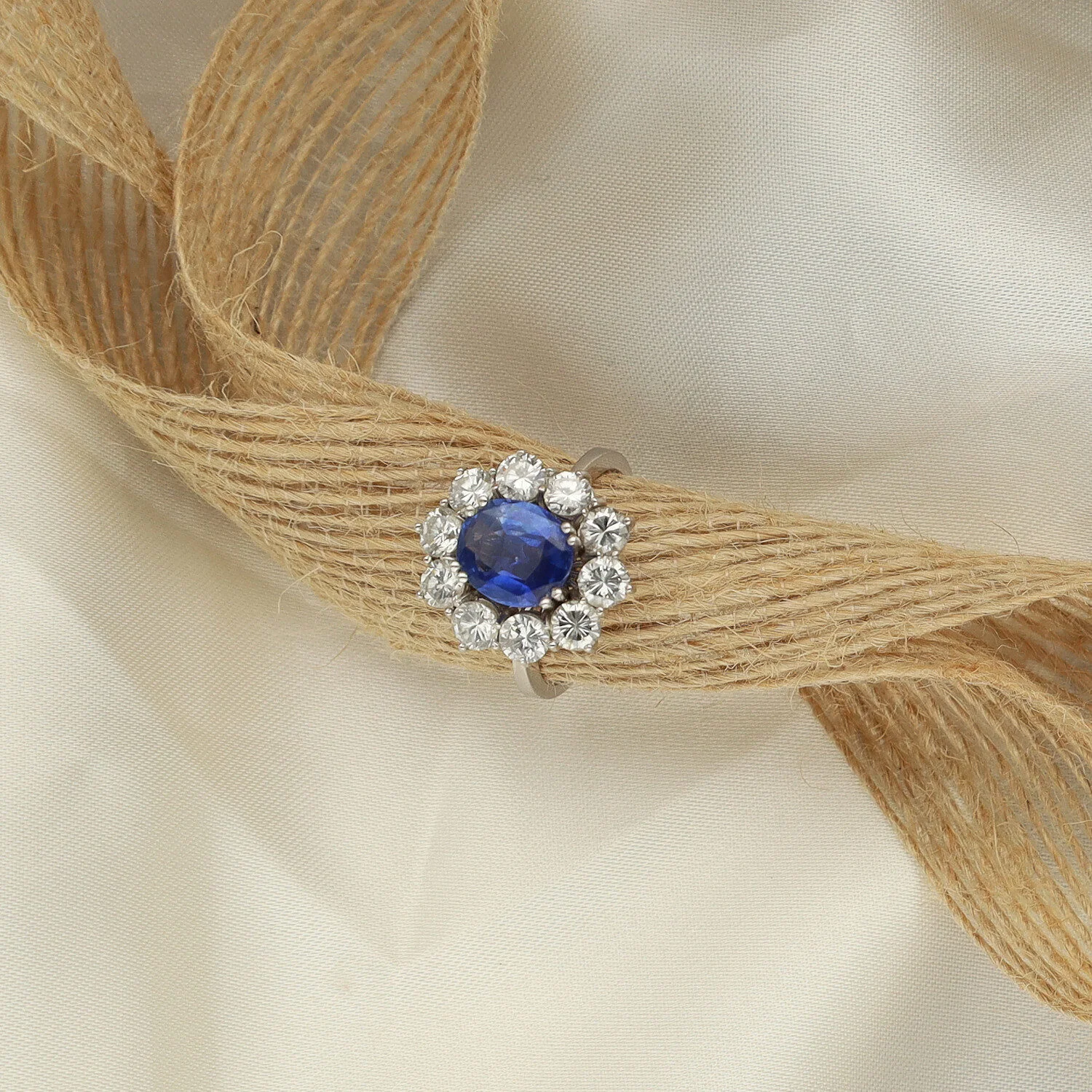Impresionante sortija vintage tipo roseta en oro blanco de 18 quilates, protagonizada por un majestuoso zafiro talla oval de 4.71 ct aprox, cuya intensidad y profundidad cromática capturan la mirada con elegancia atemporal.
