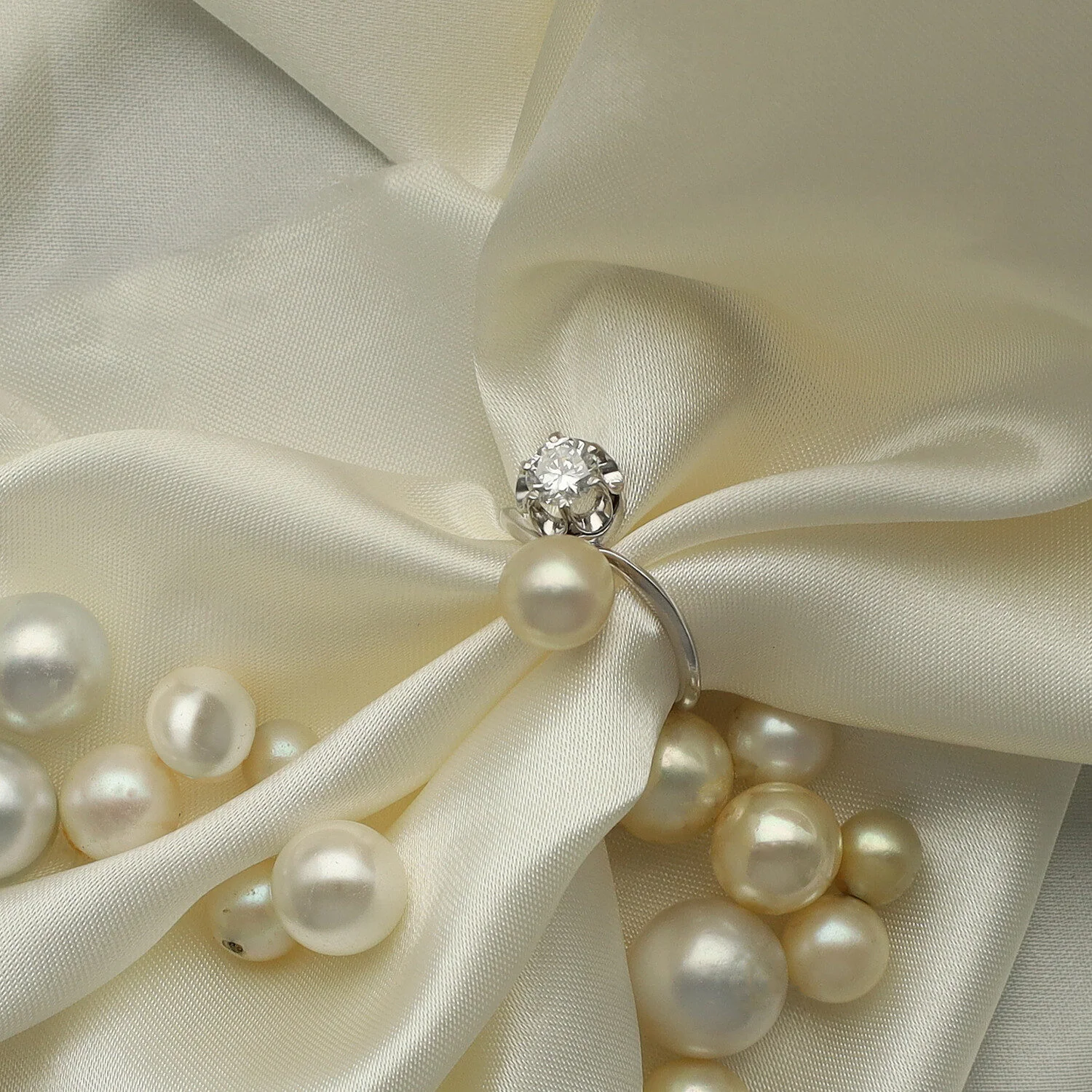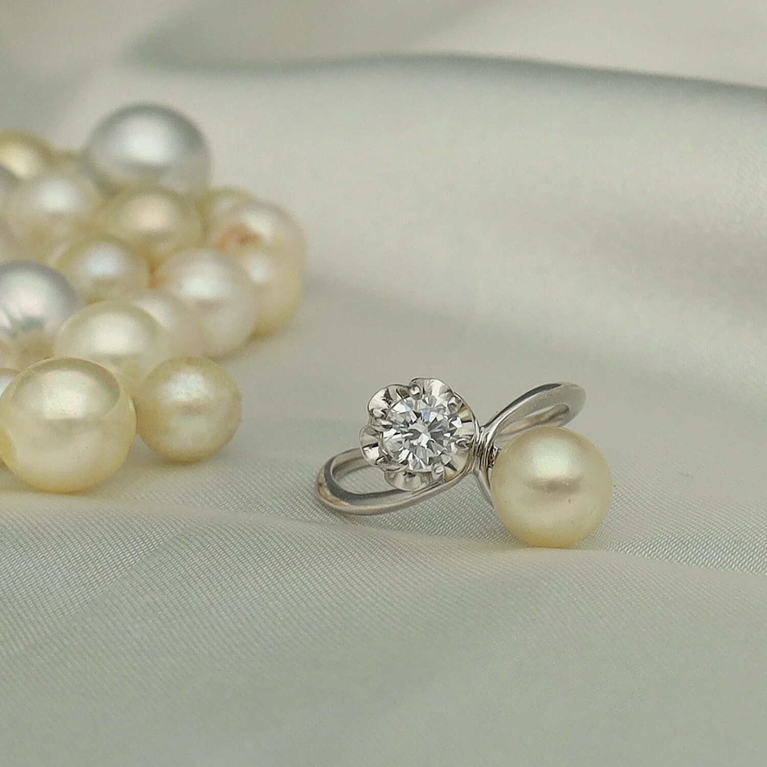 Dos mundos se encuentran en perfecta armonía: una delicada perla Akoya de 2 mm, de suave y sedoso lustre, símbolo de pureza y feminidad, y un deslumbrante diamante natural talla brillante de 0.56 ct aprox, con un estimado color F y pureza VS1, que irradia luz con una intensidad excepcional.