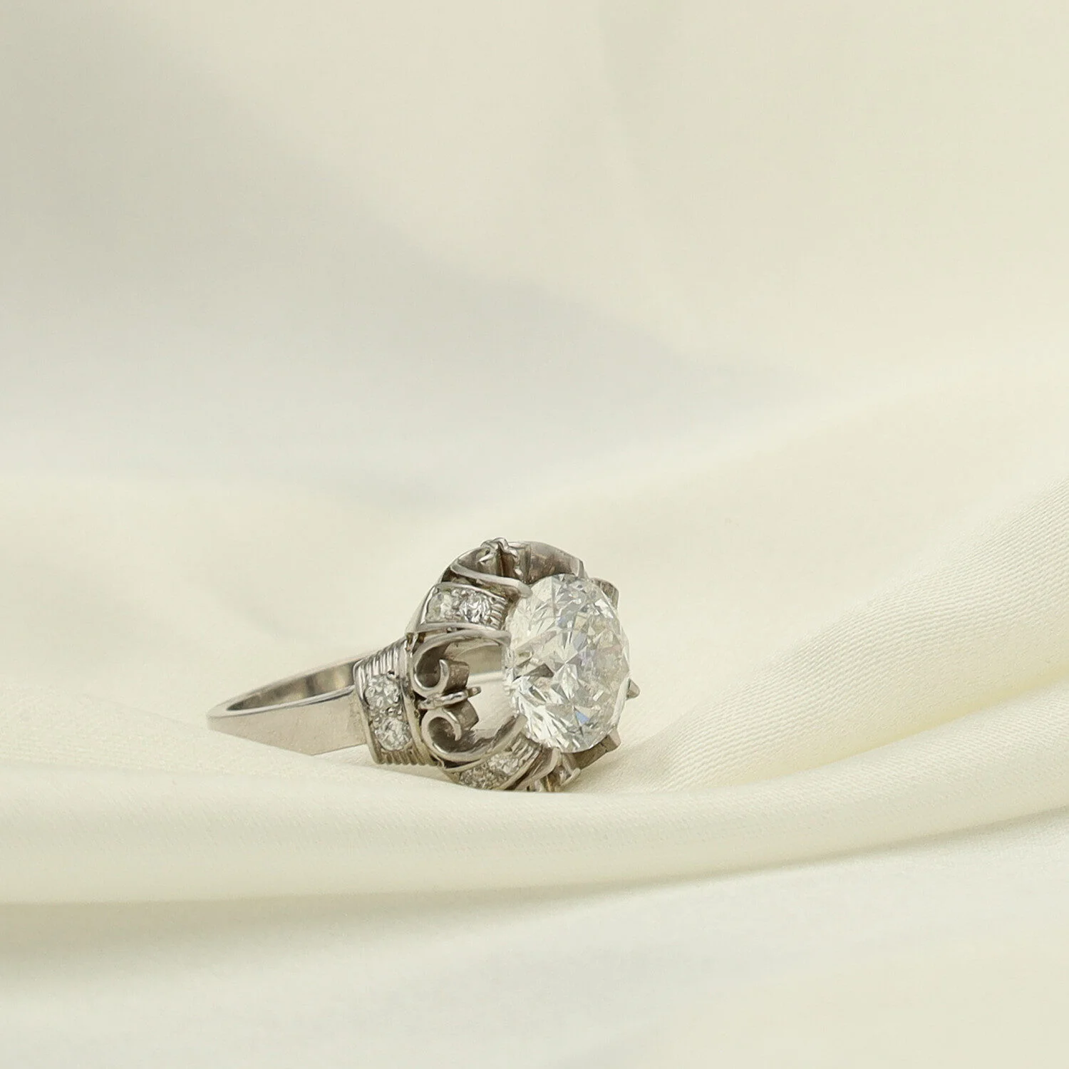 Este anillo de compromiso en platino deslumbra por su montura exquisitamente elaborada, con delicados calados laterales que revelan un trabajo artesanal de gran detalle.