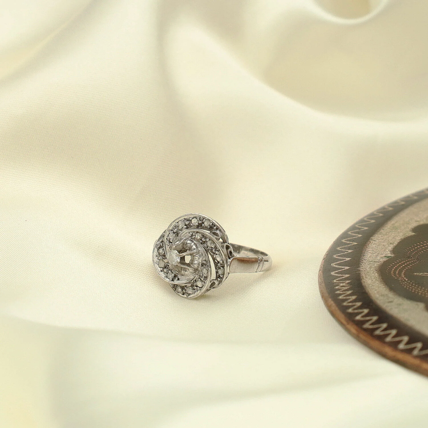 Anillo vintage en oro blanco con una elegante montura en espiral, donde 16 diamantes talla roca se entrelazan armoniosamente en los brazos.