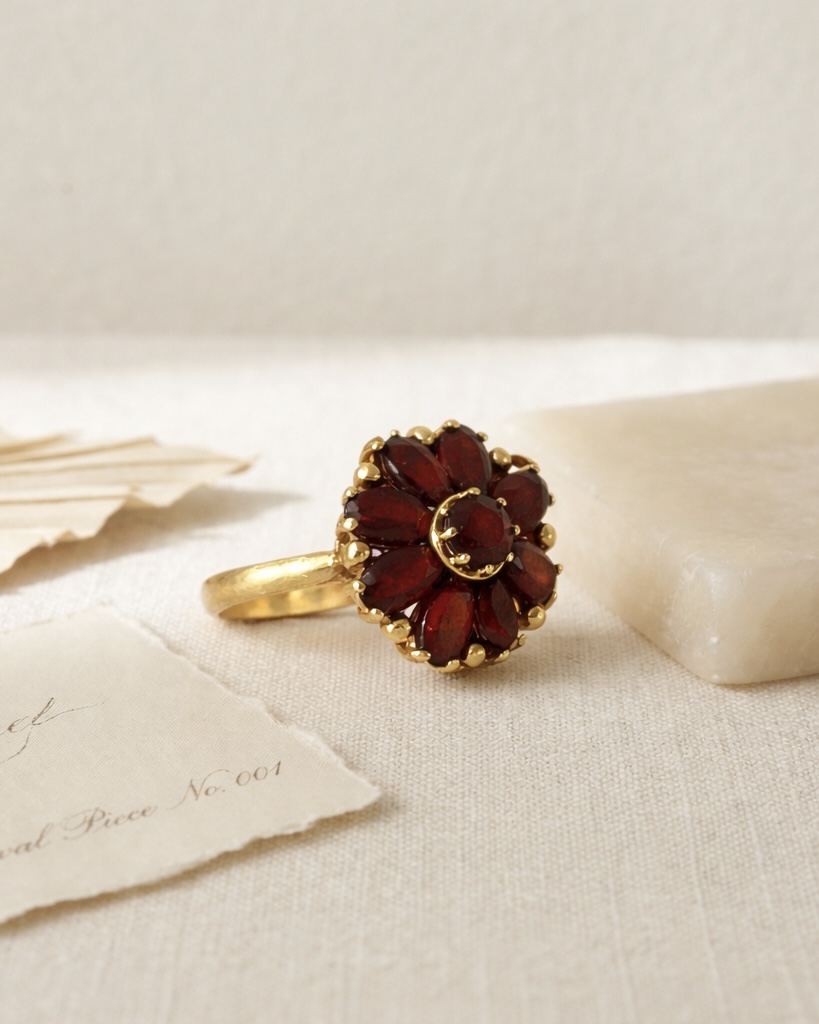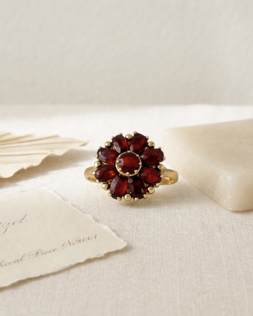 Delicada y cautivadora, esta sortija en oro amarillo de 18 quilates presenta un diseño en forma de flor compuesto por un granate central de 0,20 ct en talla brillante, rodeado por ocho granates talla ovalada de 4,36 x 3,11 mm que realzan su intenso color rojo profundo.