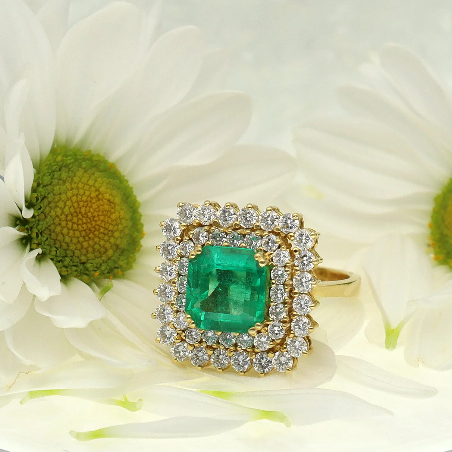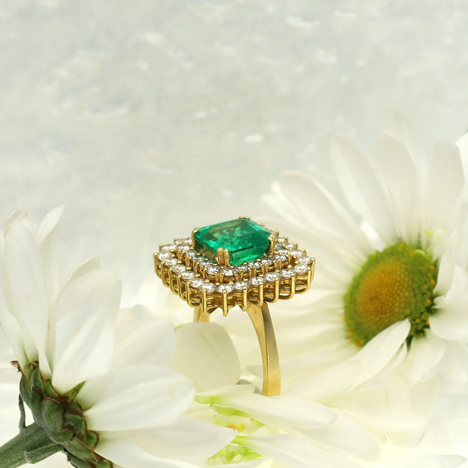 Con una estética atemporal, esta impresionante sortija vintage en oro amarillo de 18k encarna la sofisticación clásica. Su montura cuadrada realza la belleza de la esmeralda central de 4.15 ct aprox, de talla esmeralda cuadrada, que emana un verde profundo y cautivador. Rodeando la piedra preciosa, dos delicadas orlas de diamantes naturales talla brillante con un total de 2.7 ct aportan un brillo inigualable, creando un contraste sublime que magnifica la esencia de esta joya única. Una pieza que no solo resalta por su belleza, sino que cuenta con la elegancia de un diseño que trasciende el tiempo, ideal para quienes buscan distinción y exclusividad en cada detalle.